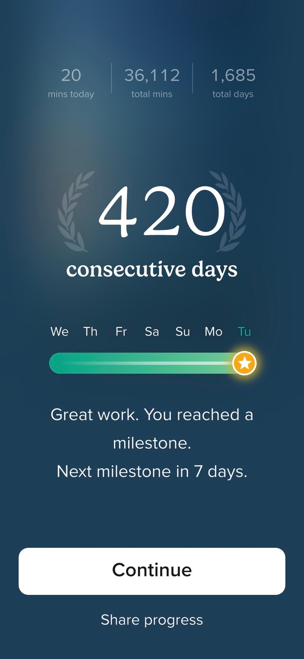 Before today my longest consecutive run was 322 days. I have had a regular meditation practice for many years, but there have always been missed days sprinkled in.